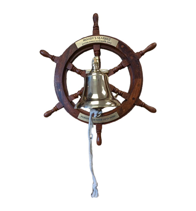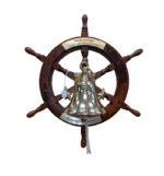 18″ ships wheel, choice of anchor bell pictured or comparable 5″ bell, and engraving. Engraving area is limited to two lines at the top and two at the bottom. If you would like a different bell, please contact us to check availability.