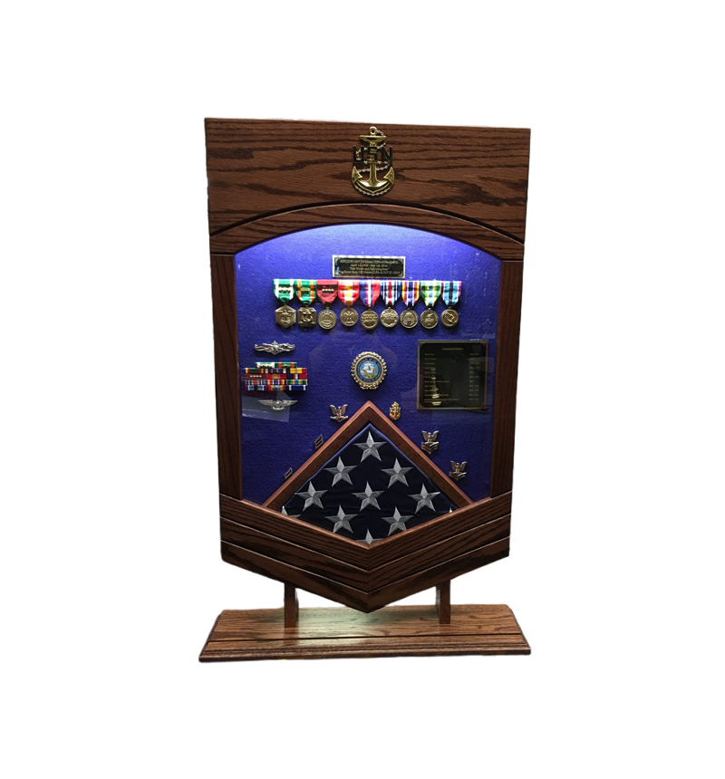Beautifully crafted box, comes on a stand with a groove cut for coins, a string of LED lights were added for flair. FOR $25 YOU CAN UPGRADE TO A 5″ CPO,SCPO or MCPO BRASS ANCHOR INSTEAD OF THE WOODEN EAGLE AND STARS. Pictured is mahogany , contents, engraving or mounting fees are not included. Please ask about build times as the vary.