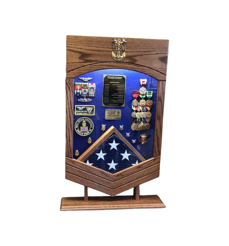 Beautifully crafted box, comes on a stand with a groove cut for coins, a string of LED lights were added for flair. FOR $25 YOU CAN UPGRADE TO A 5″ CPO,SCPO or MCPO BRASS ANCHOR INSTEAD OF THE WOODEN EAGLE AND STARS. Pictured is mahogany , contents, engraving or mounting fees are not included. Please ask about build times as the vary.