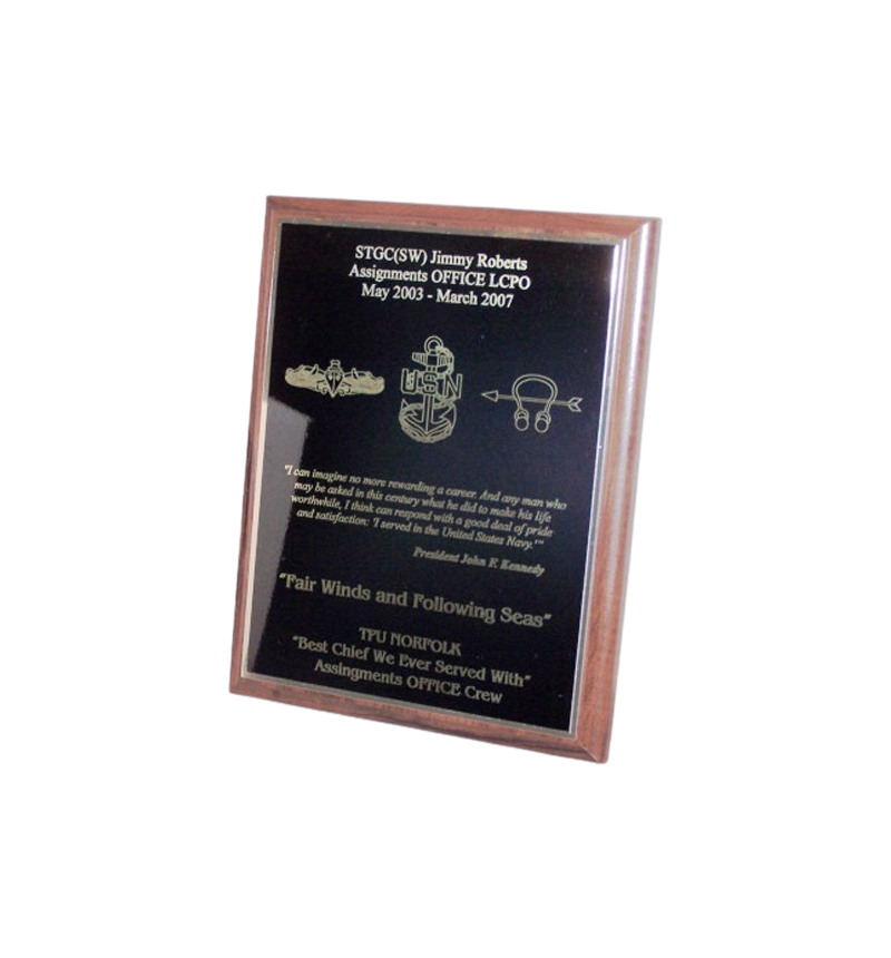 9×12 dark cherry finish, double plated engraving plate. Customizations available. Artwork fees may apply, but we provide, ranks, rates, some symbols, and some command logos if available, free of charge. Provide information in the comment box at checkout, or email us at sales@seabag2.com