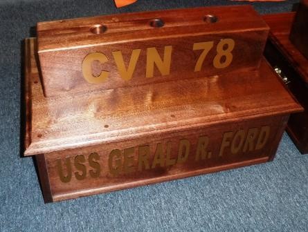 This beautifully crafted two tier flag stand is weighted for stability. Brass handles on the sides, and rubber feet on the bottom to protect the finish. Includes ship/command name and hull number(if applicable) laser cut from black acrylic with gold vinyl face, or on a black brass plate. If you would like the ship name on a wooden carving, please let us know and we will update the quote accordingly. Allow 4-6 weeks for manufacture