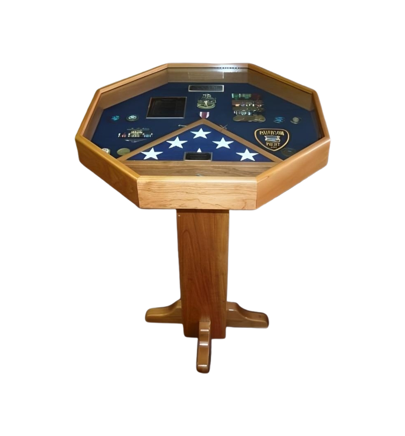 Display your military memorabilia and honors in a handcrafted custom octagon wood table built for strength, beauty, and lasting presentation.