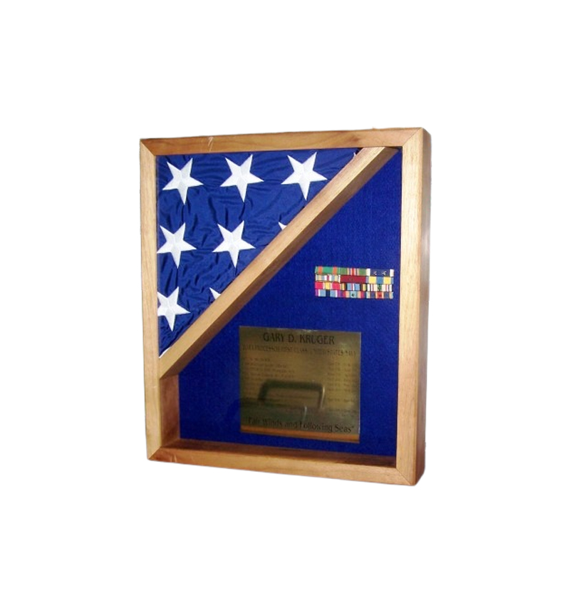 SMALL RECTANGLE MEASURES 15X17X3. HOLDS 3X5 FLAG ONLY. CONTENTS NOT INCLUDED. CHOOSE WOOD FINISH AND FELT COLOR to add mounting fee of $40. 00, please select “1 mounting fee” from this sectio