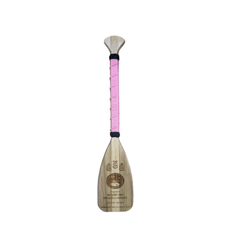 Light wood paddle is laser engraved, wrapped with fancy work ready for presentation. Put your engraving information into the comments section upon check out. Indicate one color for shaft and one color for knots. Multiple colors intertwined are $25 more. Coin recession is $5/ea. Paddles are 36″ in length.